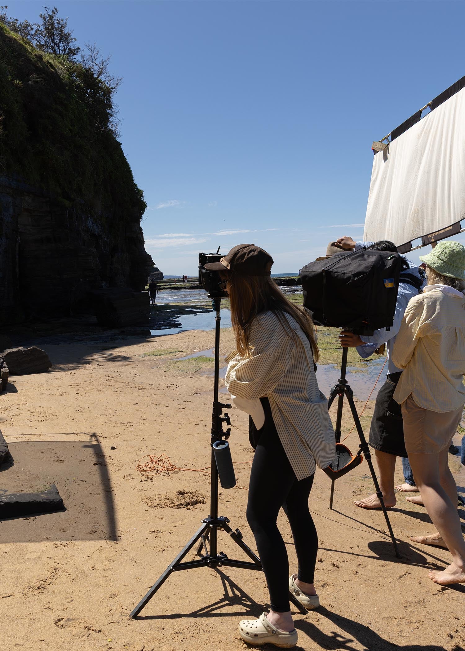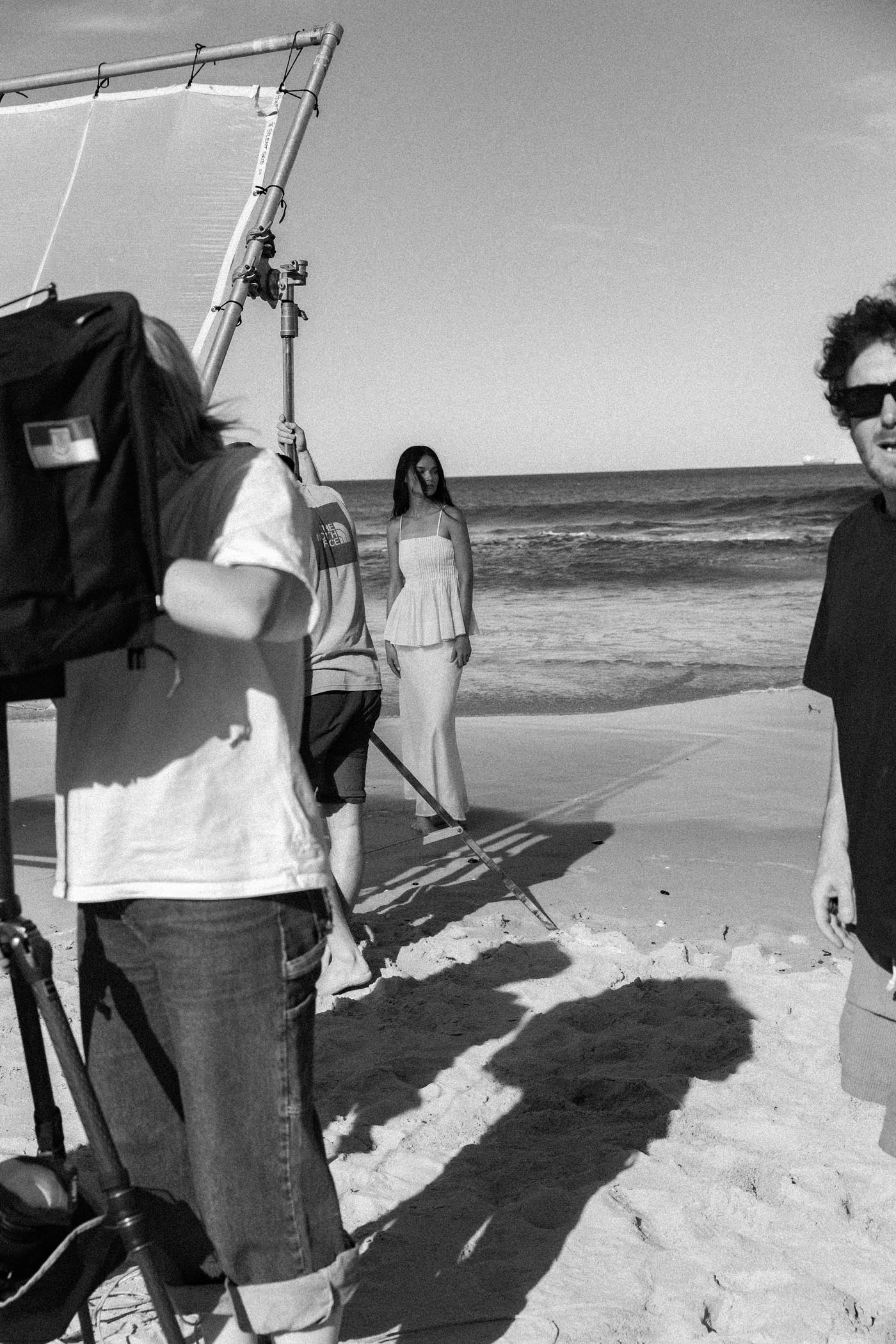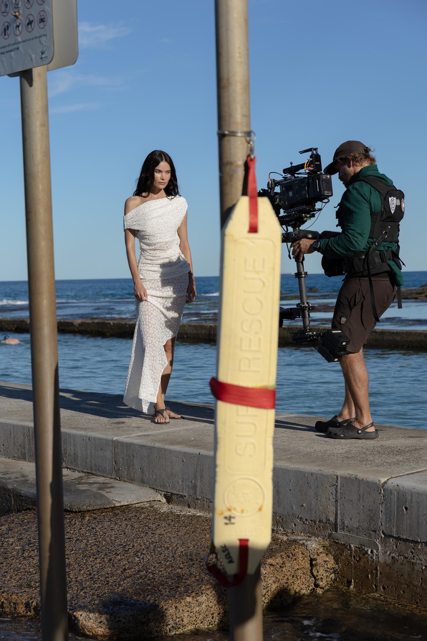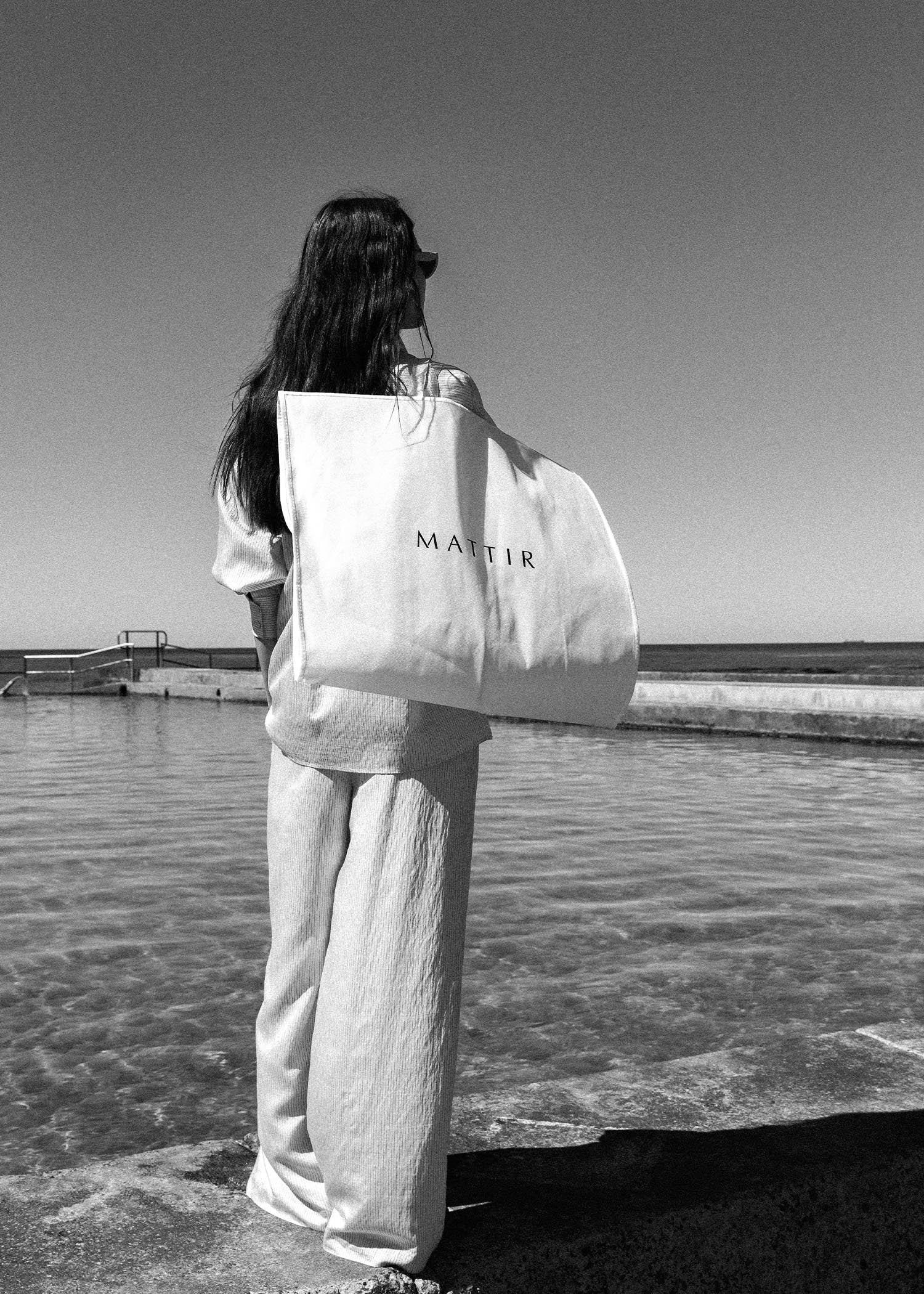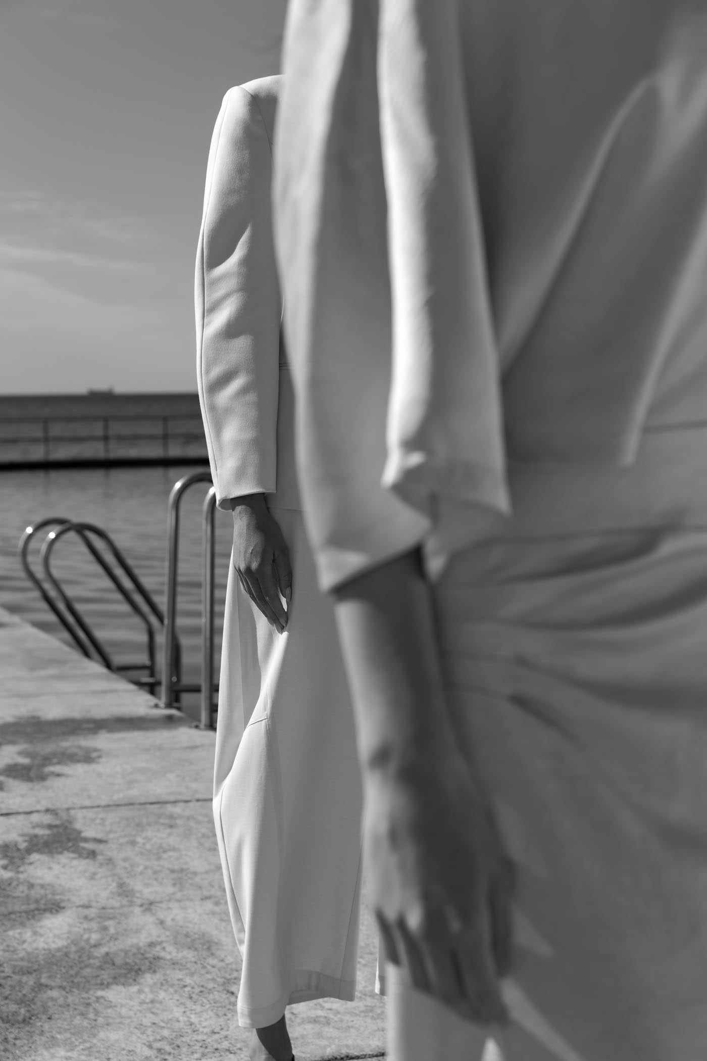 At first light, our team made their way to the coastline where rock, sand, and ocean baths sit side by side. The location offered three stages in one: sculptural cliffs, an open horizon of sand, and the still geometry of the tidal pools. Each setting revealed a different dimension of the collection, shifting with the light as the day unfolded.