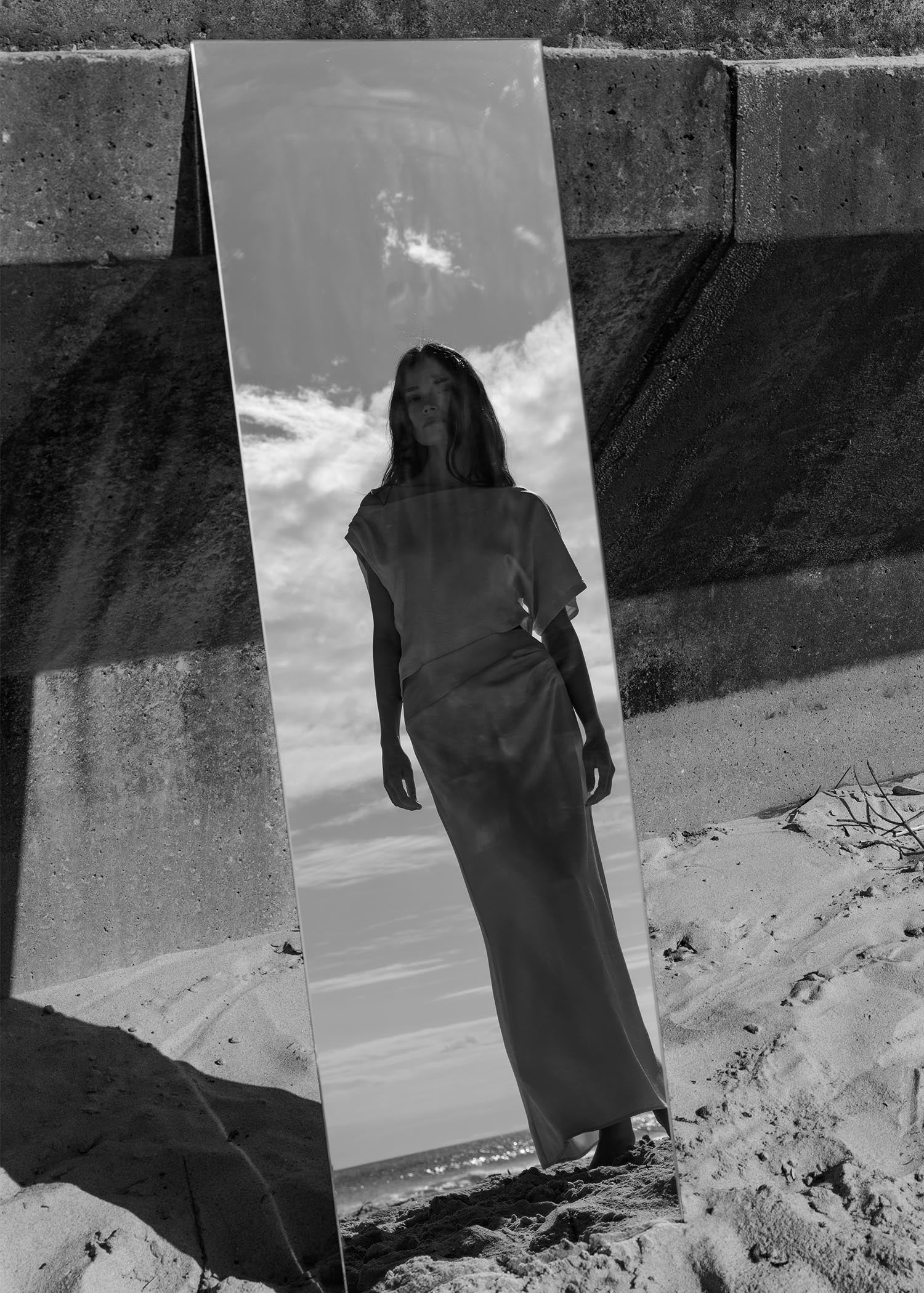 Softness against structure, leisure against formality. Sculptural suiting is tempered by fluid drape; utility denim finds refinement in proportion; delicate lace and sheer layers sit in dialogue with grounded tailoring. Each piece is conceived as both statement and foundation, designed to move seamlessly between day and night, coast and city.