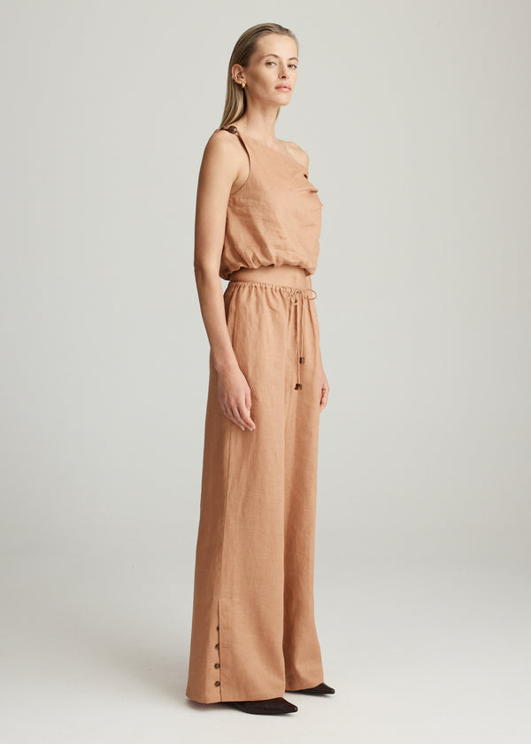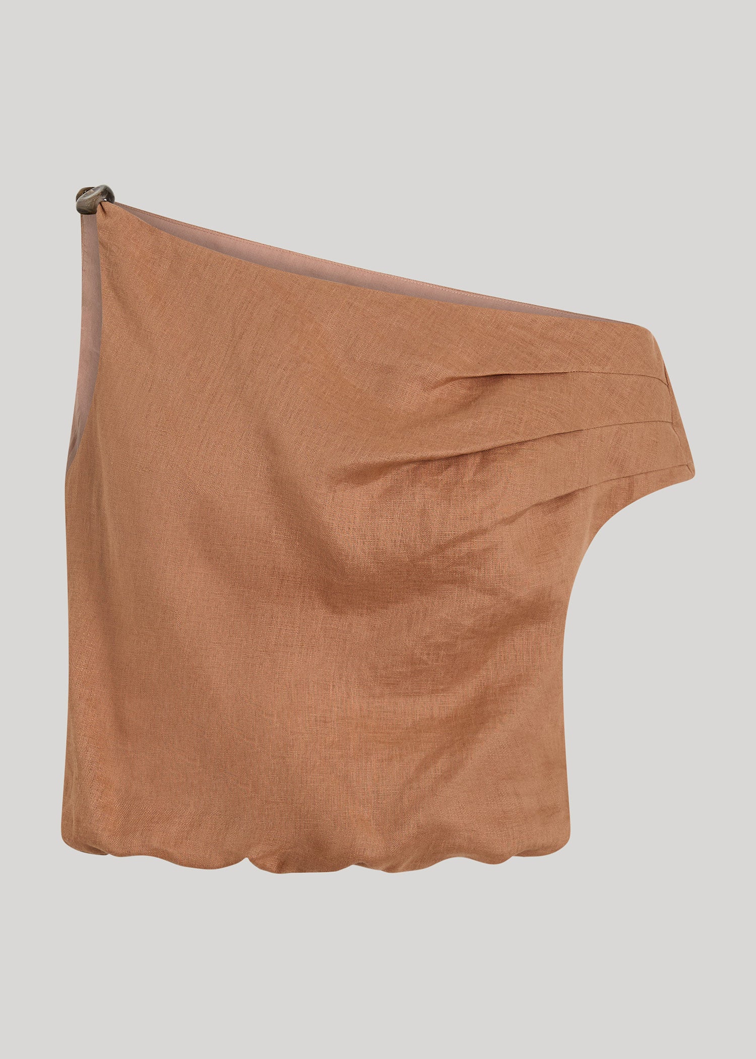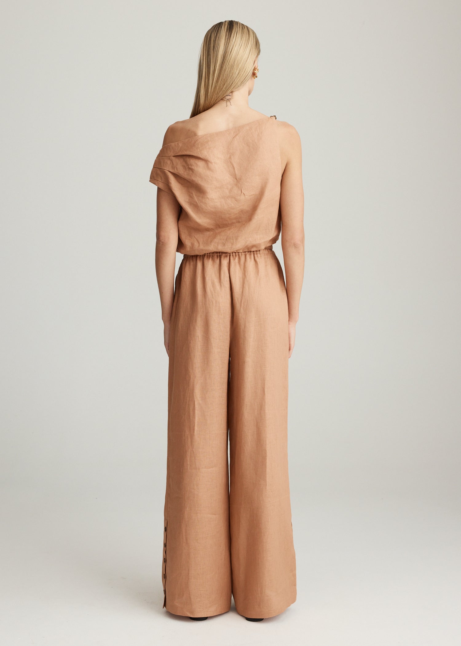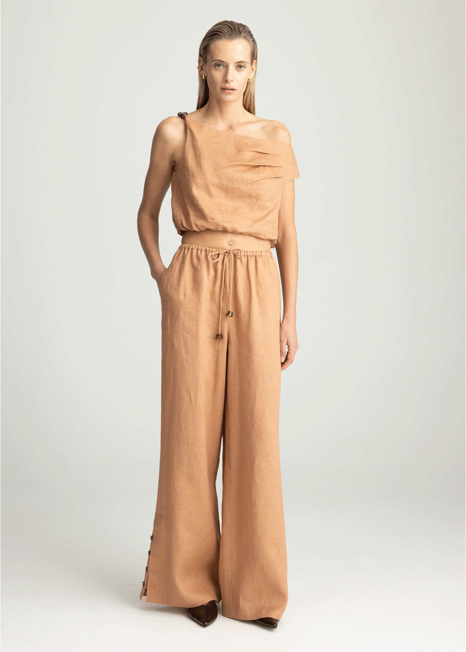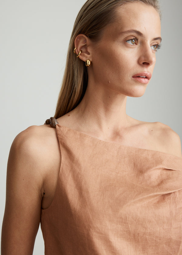 The Aera Linen Top in Terracotta is an a-symmetrical cut from breathable natural linen. Finished with 2 beads on one shoulder and pin tucks on the other, it’s an effortless match with the Valen Pant or styled into your everyday mix.