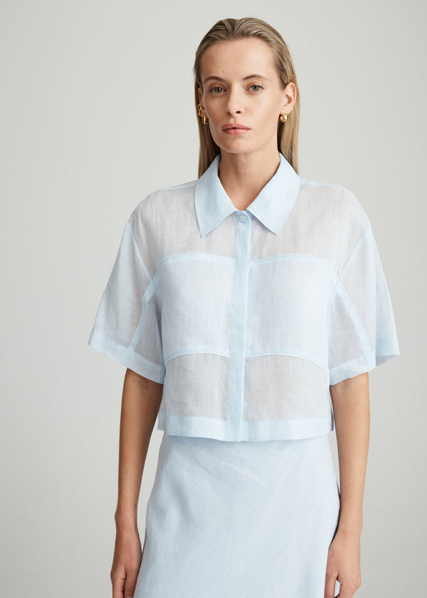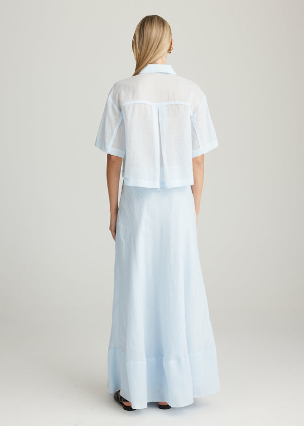 A wardrobe staple designed to wear on repeat. The Aire Ramie Crop Shirt in Ice Blue blends clean lines with soft tailoring. Made from ramie for a lightweight feel with linen-like structure, ideal for styling with the Aire Circle Skirt or paired back with denim.