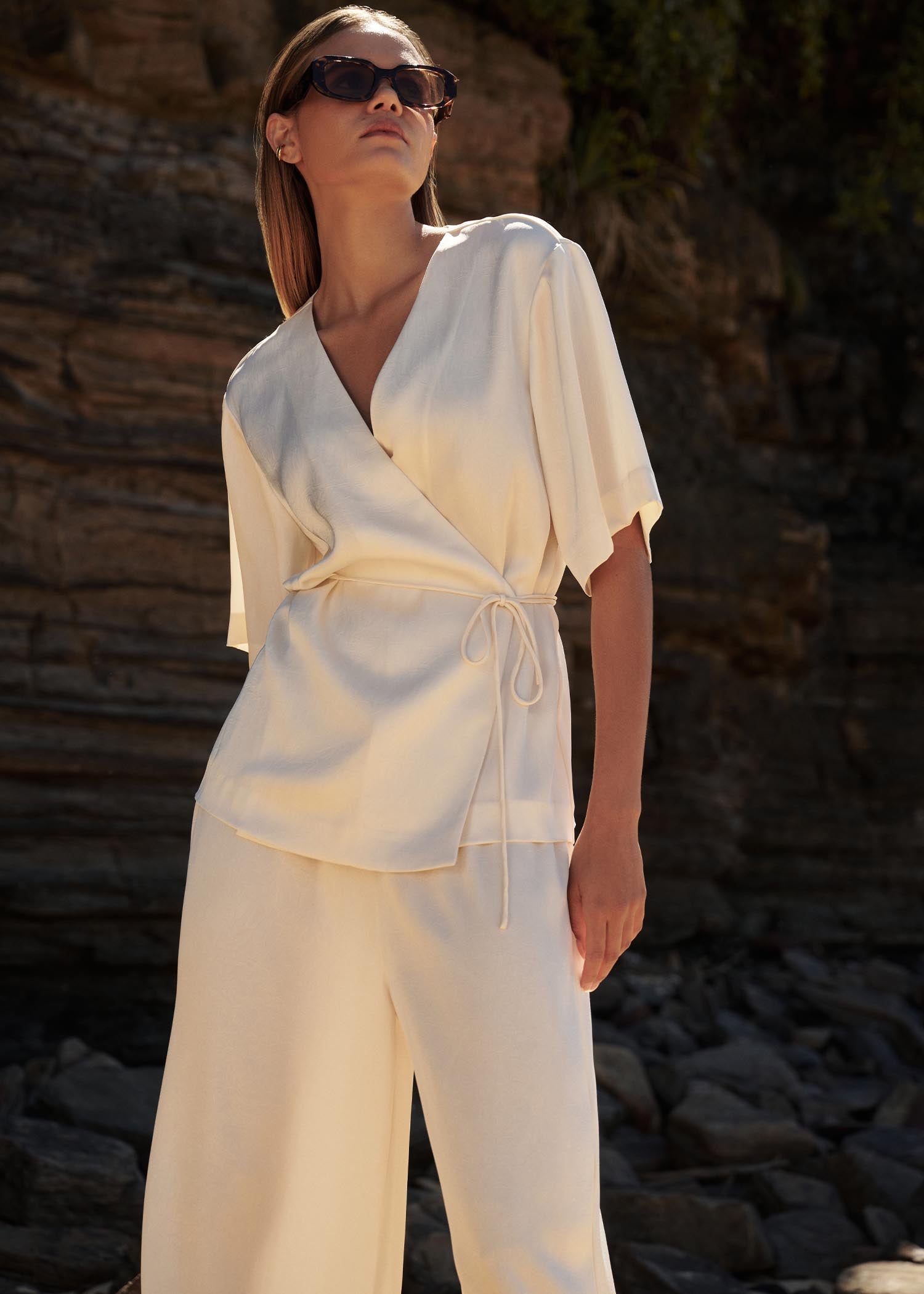 The Astra Top in Pearl is a modern wrap-style blouse with subtle structure. Cut in a crinkle satin fabrication, and designed with a wide V neckline, oversized short sleeves, and soft volume through the body, it ties cleanly at the side for an adjustable fit. Style with the matching pant or pair back effortlessly with your existing wardrobe staples from denim to suiting.