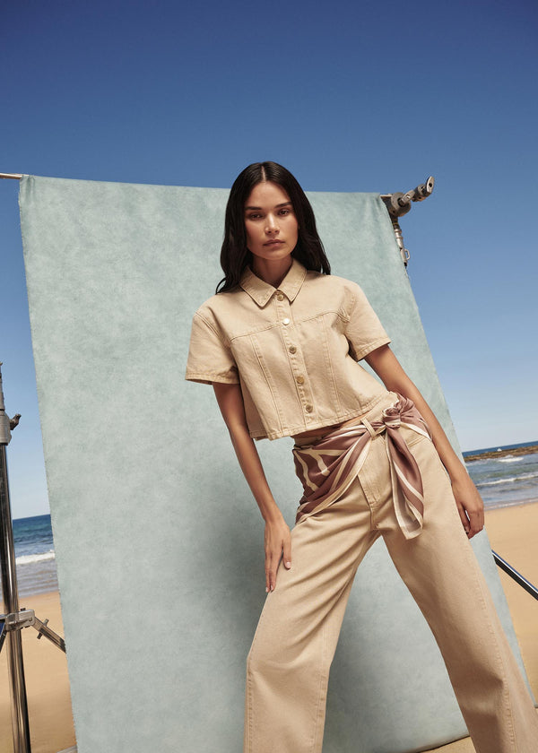 Boxy and architectural, the Atria Shirt in Stone is crafted in a beige denim with a cropped square silhouette. Turn to reveal statement panelled seams at the back. Short wide sleeves, a pointed collar, and custom MATTIR hardware bring structure to a versatile silhouette designed for layering or wearing alone.