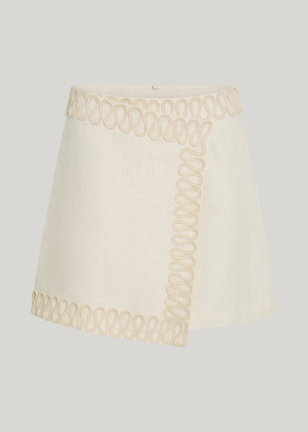 The Casa Skirt in Ivory delivers an effortless elevated silhouette for summer dressing. Designed in 100% linen with our signature appliqué detailing that has been hand-braided directly into the linen fabric. Designed to sit mid waisted and completed with an asymmetrical wrap style silhouette.