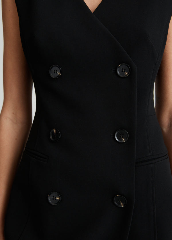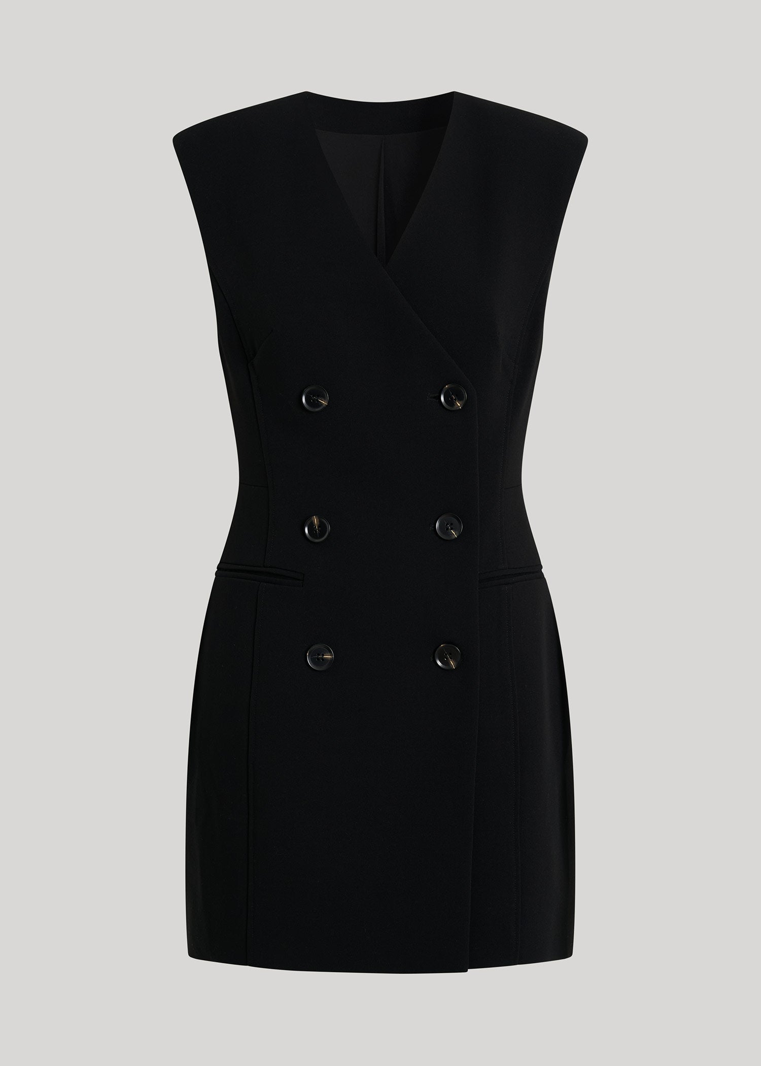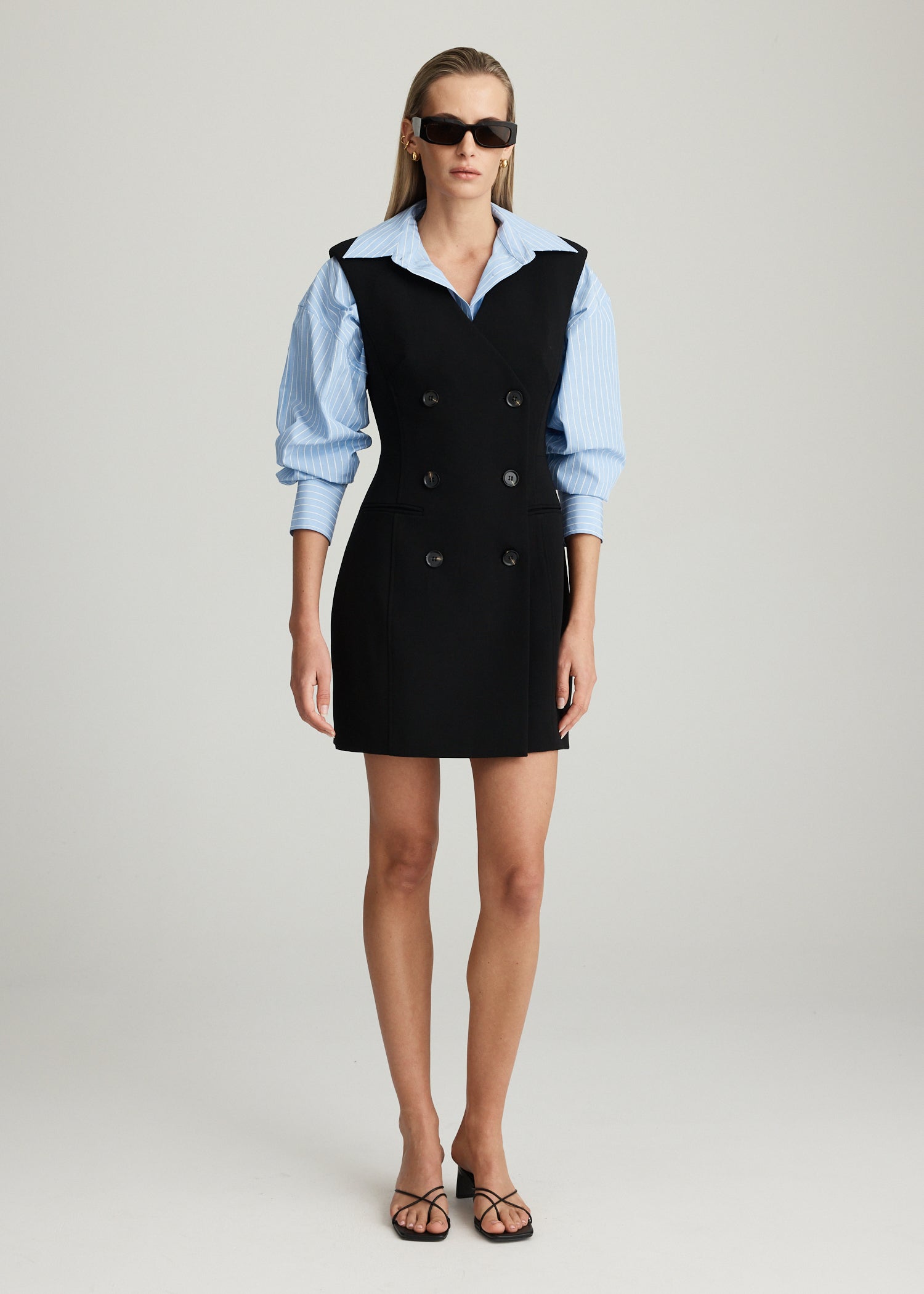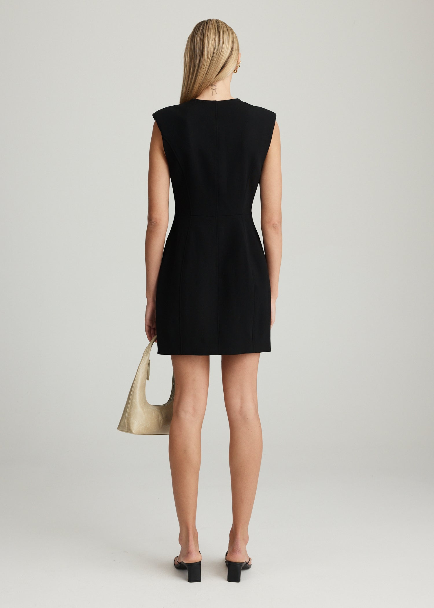 The Eclipse Dress in Black is the epitome of tailored dressing. This sleeveless mini features a v-cut neckline, double-breasted front, and precision panelling that flatters the waist. Designed in a structured fabric, it moves with you while holding it's shape — ideal for event dressing, workwear, or elevated evenings.