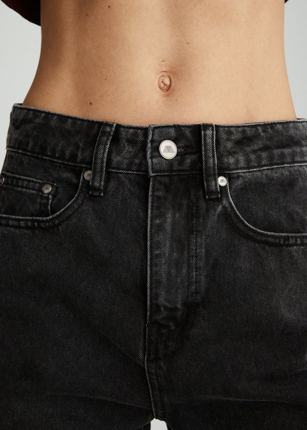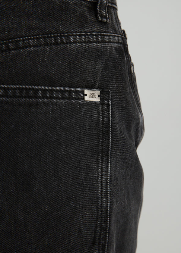 The Lumen Jean is a modern wardrobe staple with a barrel leg silhouette. Designed in black washed denim, it features a mid to lower-rise waist. Panel stitching and custom MATTIR silver hardware complete this elevated take on everyday denim.