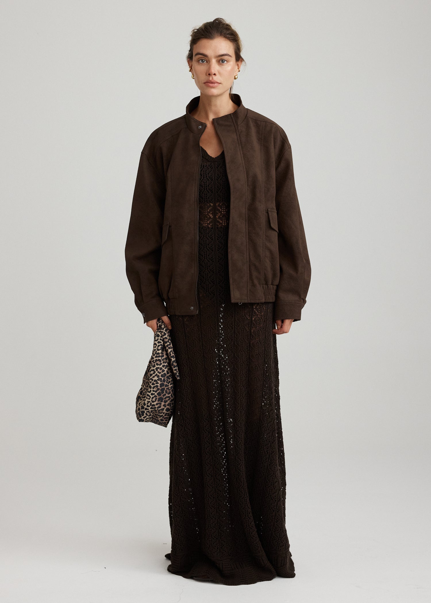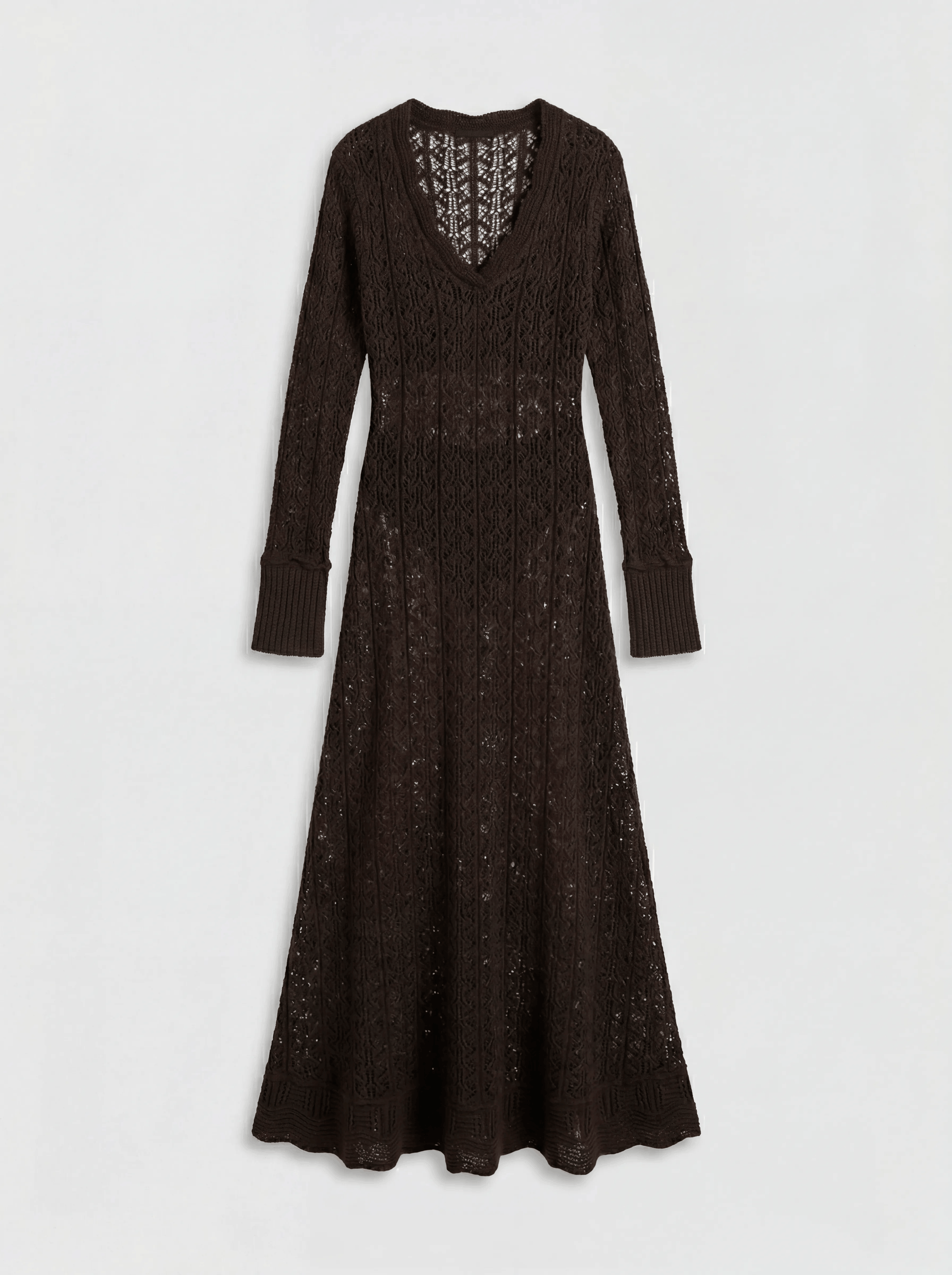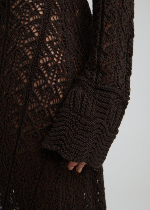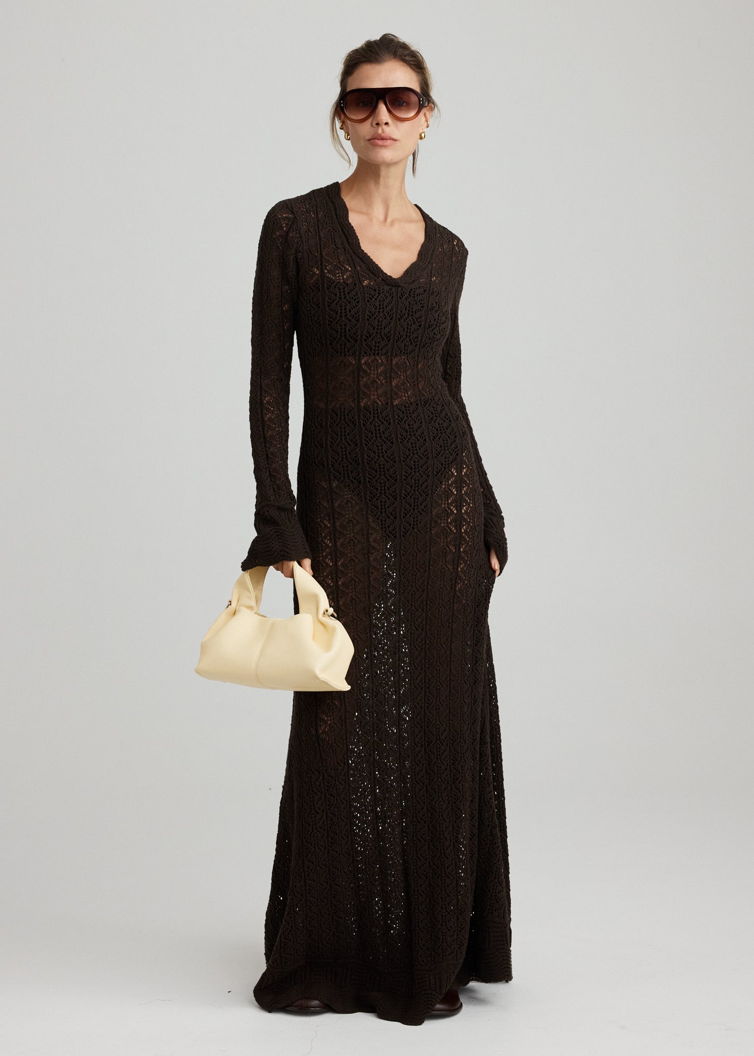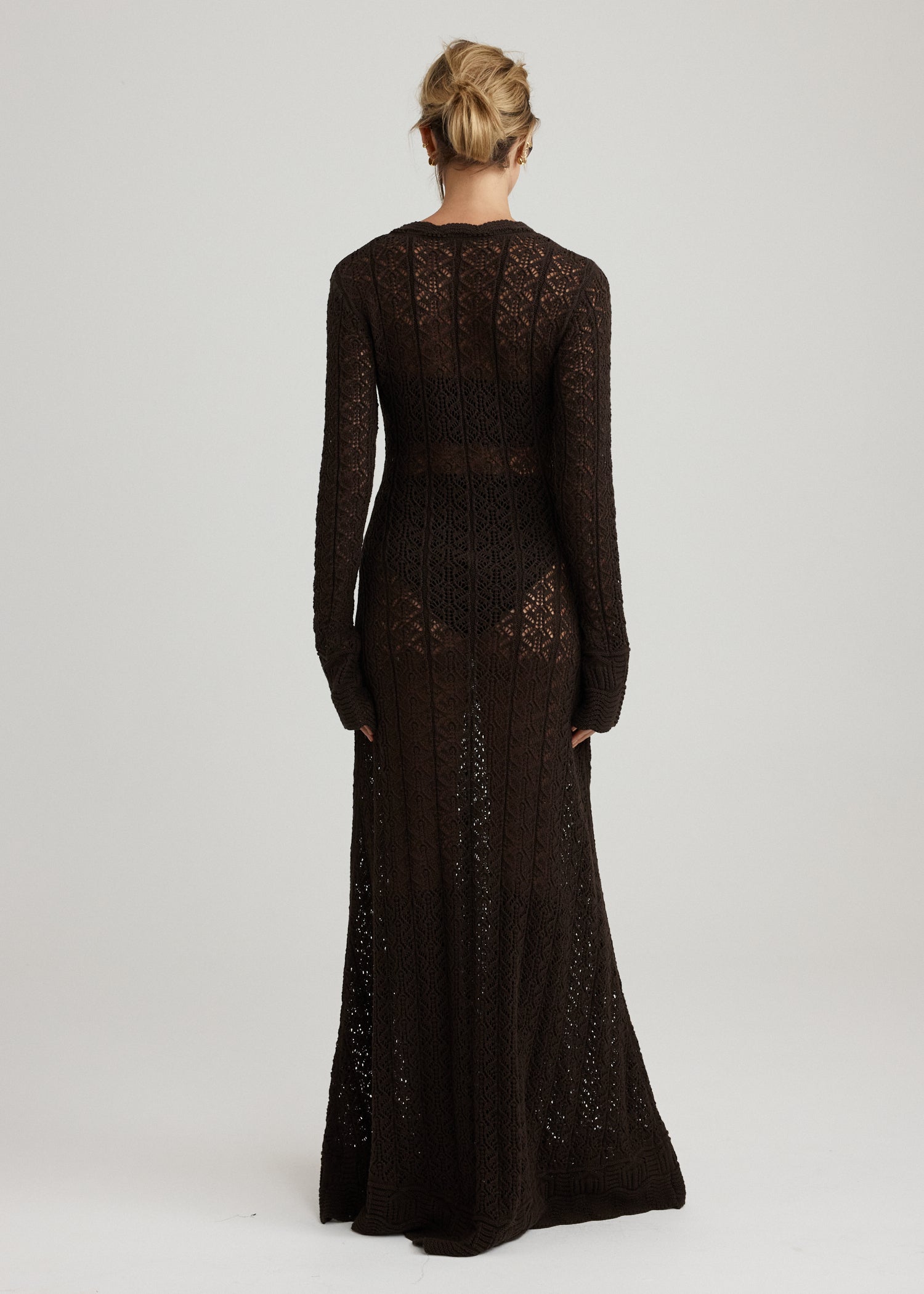 A reimagined crochet classic, made from 100% cotton creating a romantic open-knit cotton crochet fabrication. The Marlow Crochet Maxi in Burnt Cocoa is a longline maxi dress with a scalloped v-neckline and elongated cuffs. Designed for effortless day to dusk dressing, perfect to style with the Mirra Undergarments.