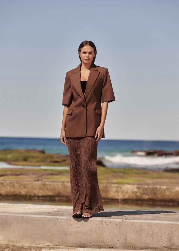 The Orah Blazer in Mocha is a short-sleeve tailored jacket designed to soften the structure of traditional suiting. With a relaxed boxy fit, sharp lapels, and single-breasted front, it layers easily over coordinating shorts or neutral trousers.