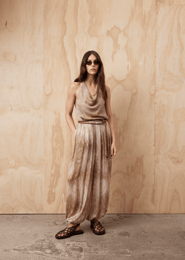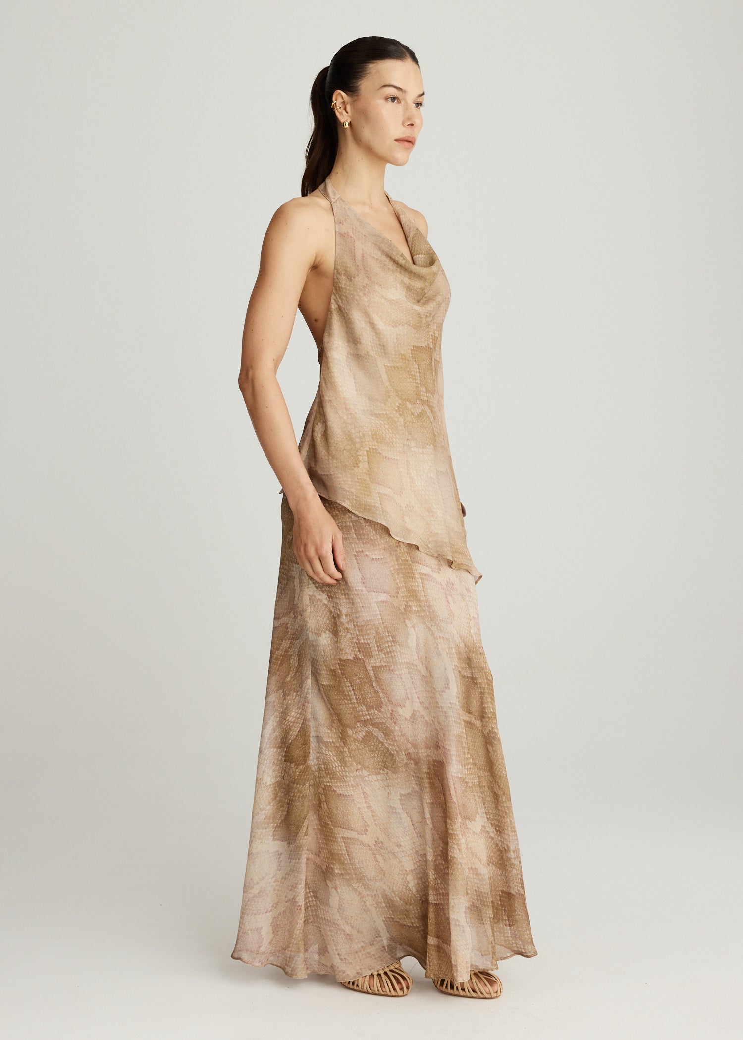 The Halter Top in Python showcases a cowl neckline and a dropped back . Cut in a custom python printed semi sheer fabrication. Ideal for styling with the Python Bias Skirt or pair back with everyday denim.