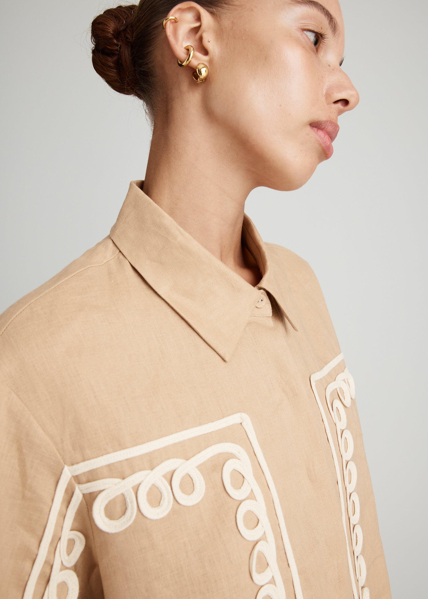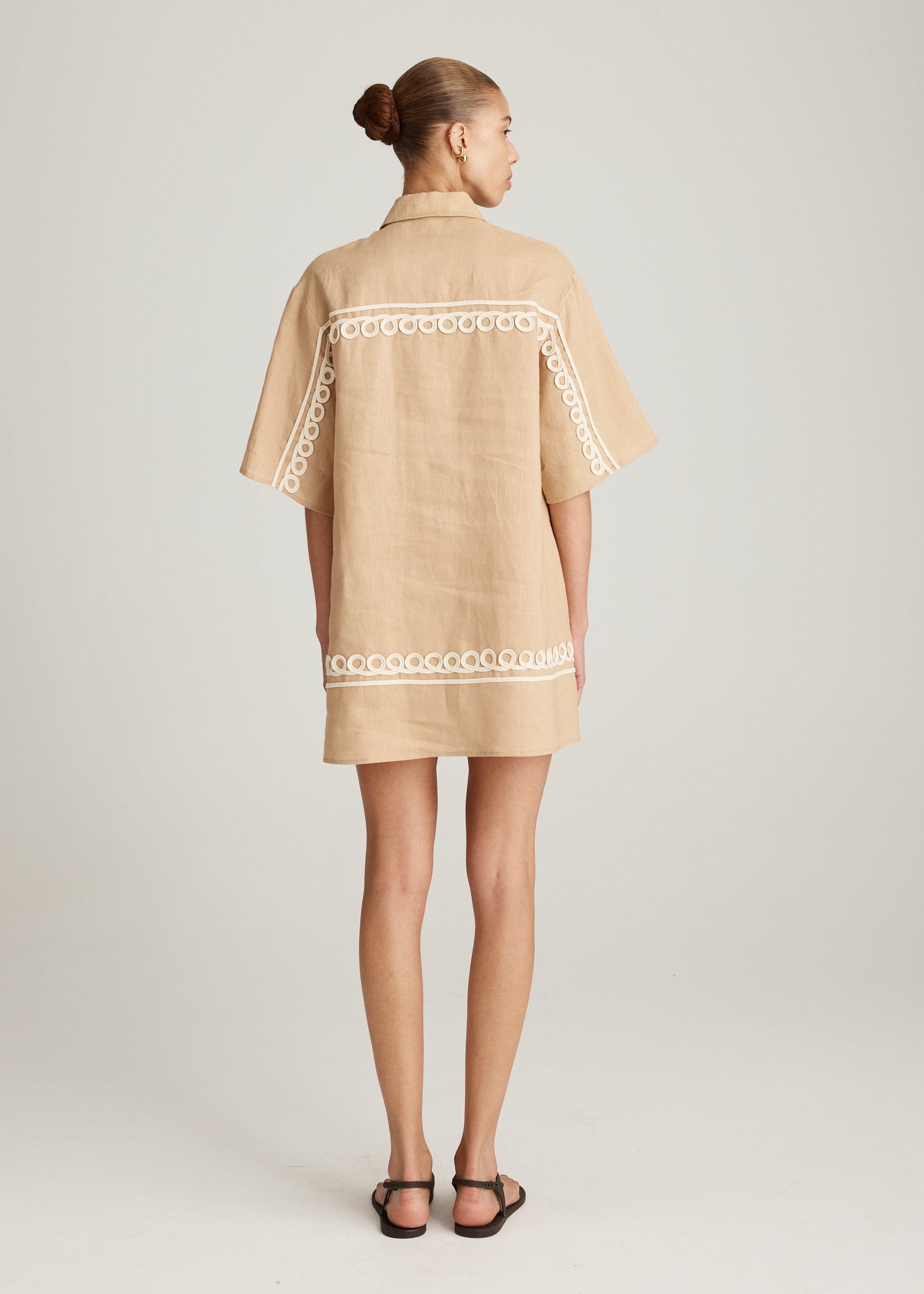 The Raven Rope Dress in Sand is an elevated take on an everyday summer essential. A hand-braided rope has been applied and embroidered directly onto the body for a signature MATTIR appliqué finish. Cut in breathable 100% linen fabrication and completed with a concealed front button placket and a shift dress silhouette for a comfortable fit.