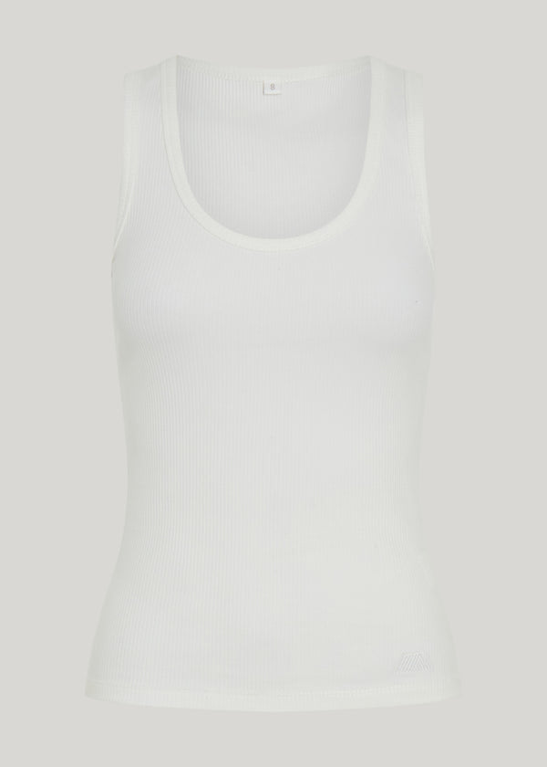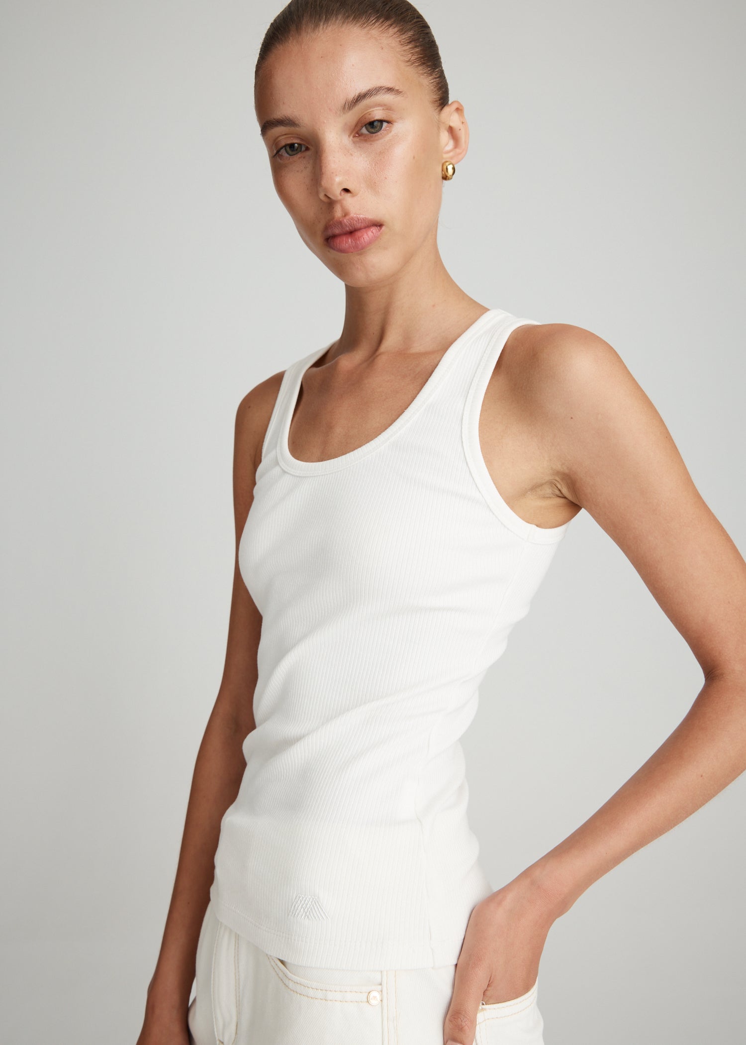 The Rellar Scoop Tank in White is a softly fitted tank designed for layering or wearing solo. Featuring wide straps, a low scoop neckline, and fine ribbed texture, it offers comfort and structure in equal measure.