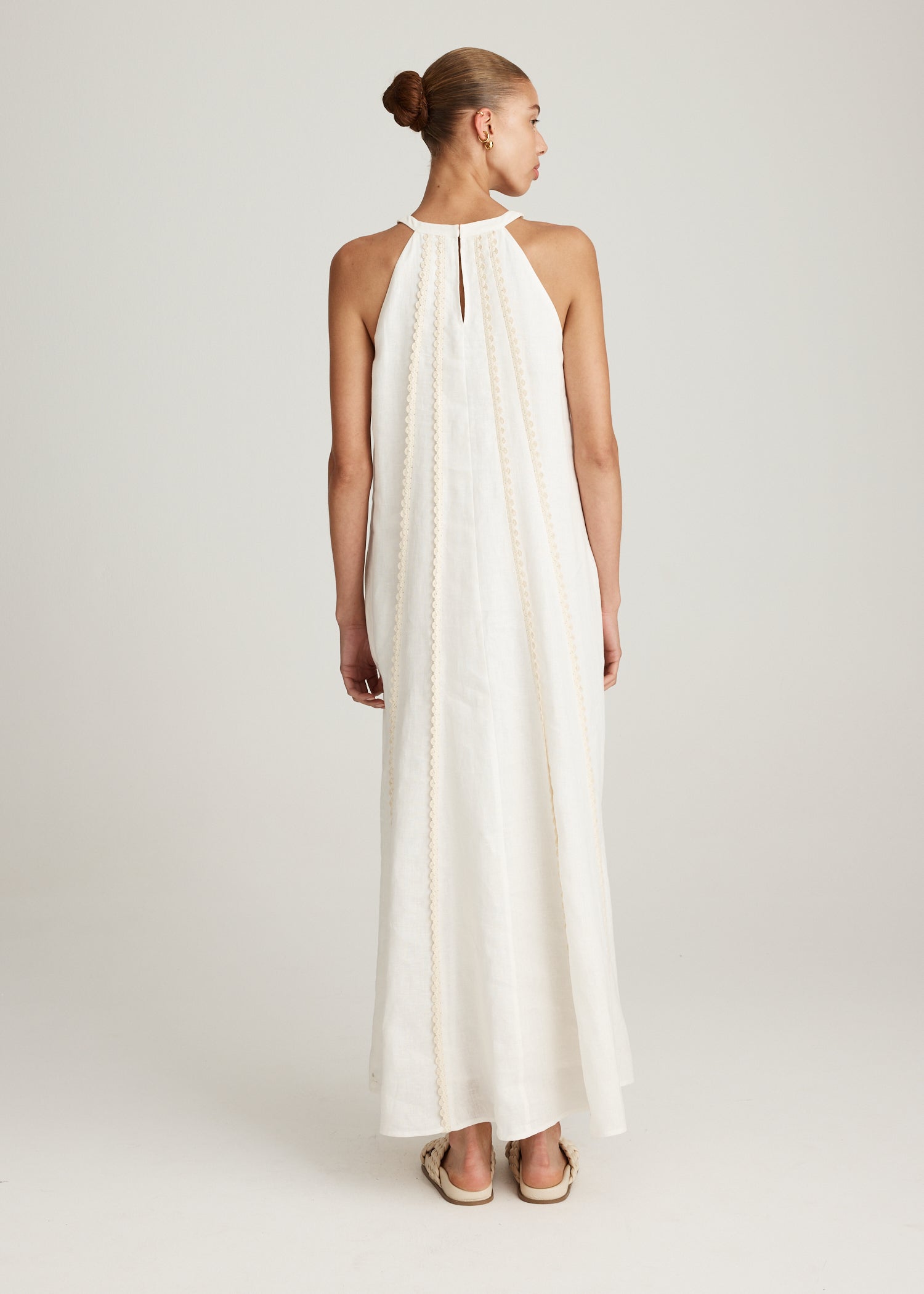 The Salla Linen Dress in White embodies effortless elegance with a free-flowing silhouette perfect for warm weather dressing. Crafted from breathable 100% linen, it features a high halter-style neckline that gently frames the shoulders. Intricate tonal appliqué trim runs vertically through the dress, adding subtle texture. A keyhole opening at the back offers a considered point of detail, while the full, airy skirt moves beautifully with every step.