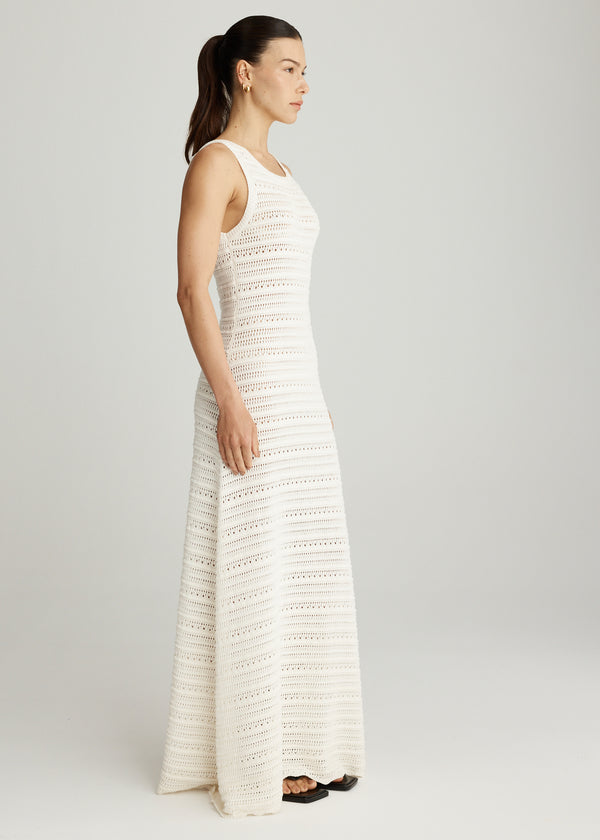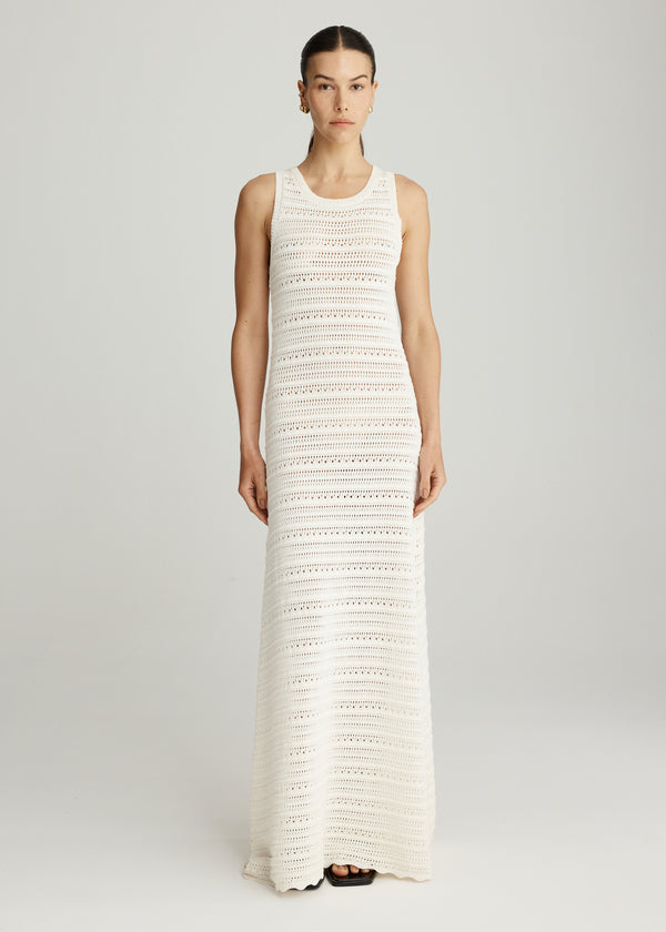 A minimalist interpretation of summer dressing. The Siena Knit Dress in White is crafted from an open-knit cotton crochet. With a round ribbed neckline and column silhouette, this maxi is designed for effortless day to dusk dressing.