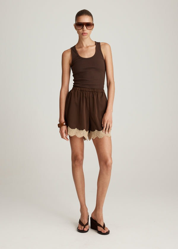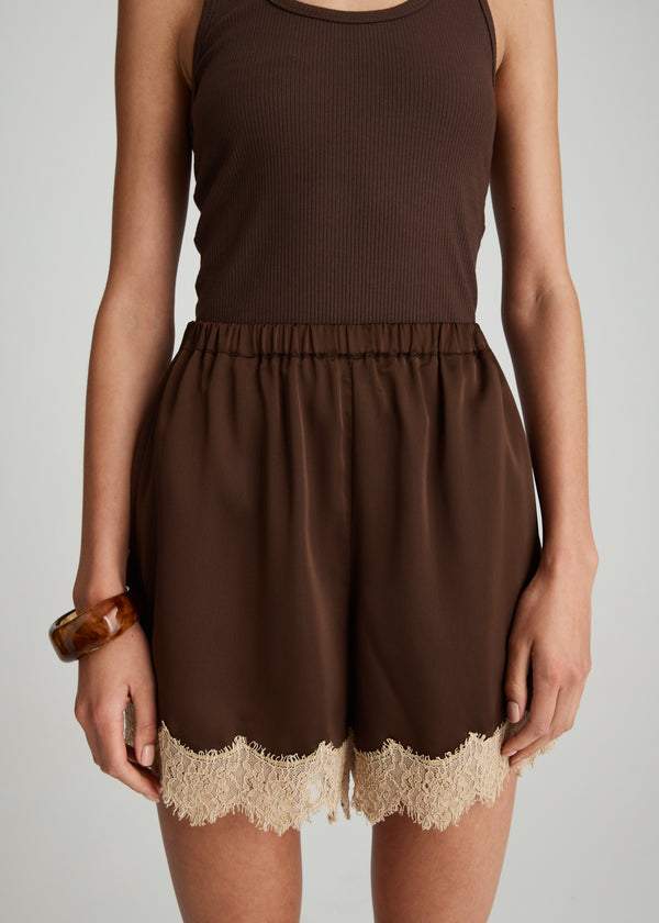 The Soreli Lace Short in Chocolate introduces effortless femininity to everyday dressing. Cut in a relaxed silhouette, it features an elasticated waistband, internal side pockets, and delicate contrast lace trimming the hem for a soft, romantic finish. Style with the Soreli Lace Cami or pair back with the Rellar Scoop Tank in Dark Chocolate for a tonal look.