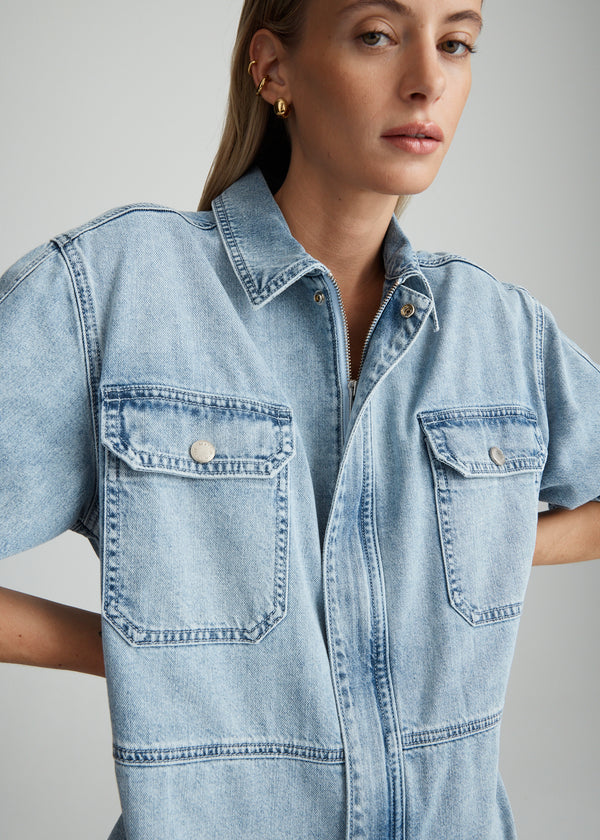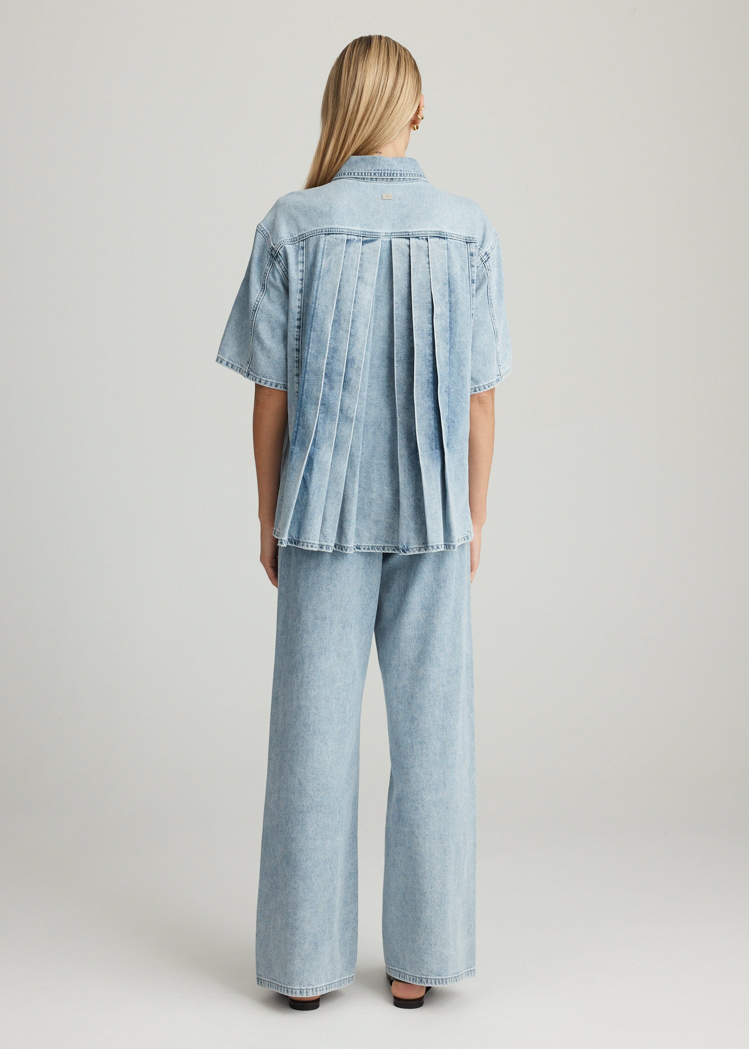 The Stellar Denim Shirt is an oversized and panelled top. Crafted from mid-weight washed denim, it features a boxy silhouette, front zip closure, and twin chest pockets with button flaps. Turn to reveal a pleated back as a point of difference.