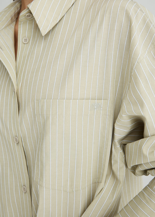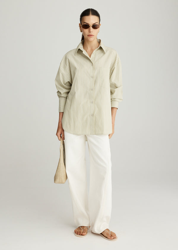 An everyday staple, redefined. The Utility Shirt in Sage Pinstripe is cut from a soft cotton-tencel blend with a relaxed shape, offering ease of wear from desk to off-duty. Designed for versatility and subtle structure with tailored cuffs and a collared neckline.