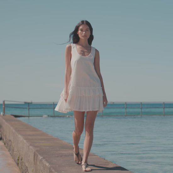 The Zera Dress in White is a playful mini dress with full movement and movement. Designed with a scoop neckline and dropped waist, it features tiered pleat panels for subtle volume and texture.